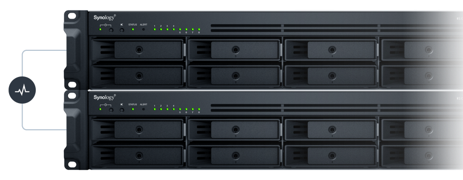 When paired with another identical unit, Synology High Availability enables automatic minute-level failover between two clustered servers in the event of a server failure to minimize service downtime.